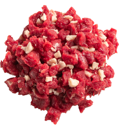 Кубики качественной говядины в идеальной пропорции дополнены кубиками жира, которые под воздействием высоких температур тают, придавая блюду неповторимую сочность.